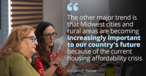 Over the past 12 years, I’ve worked with cities and states across the country to deliver economic development and real estate solutions. In this new role, I’m excited to help Midwestern cities leverage innovations from across the country and tailor them to the unique economics, real estate dynamics, and local community goals here. There’s incredible ingenuity happening in the Midwest that other regions can benefit from. The Twin Cities, in particular is currently and has been the epicenter for cultural movements in recent years, but what doesn’t get as much press are the policy innovations that have been shaping outcomes in this region for decades and that offer key lessons for other regions across the country. For example, the Twin Cities region is one of the few metros in the entire country that has taxing authority. They also consistently rank high for their parks systems and affordability. The Midwest broadly is also ahead of the curve on issues like leveraging manufactured housing solutions to speed up production and lower building costs as well as forward-thinking solutions to population decline.