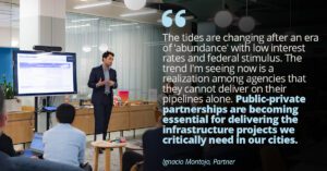 The tides are changing after an era of ‘abundance’ with low interest rates and federal stimulus. The trend I’m seeing now is a realization among agencies that they cannot deliver on their pipelines alone. Public-private partnerships (P3s) are becoming essential for delivering the infrastructure projects we critically need in our cities.